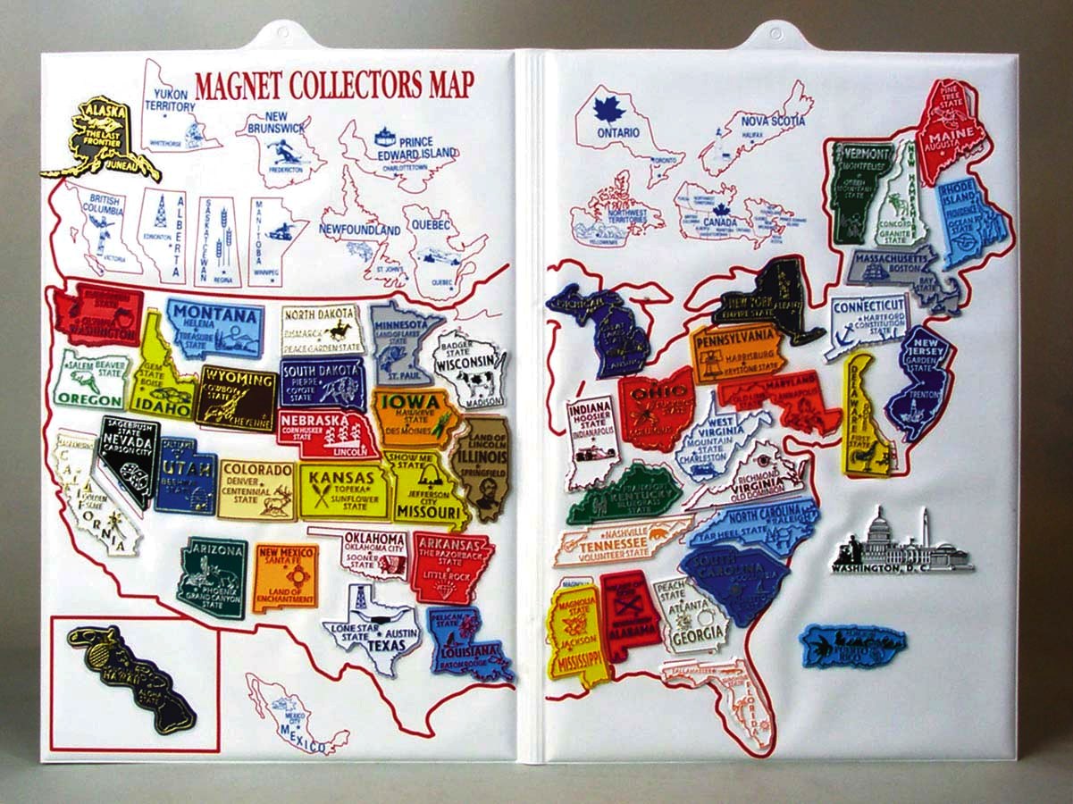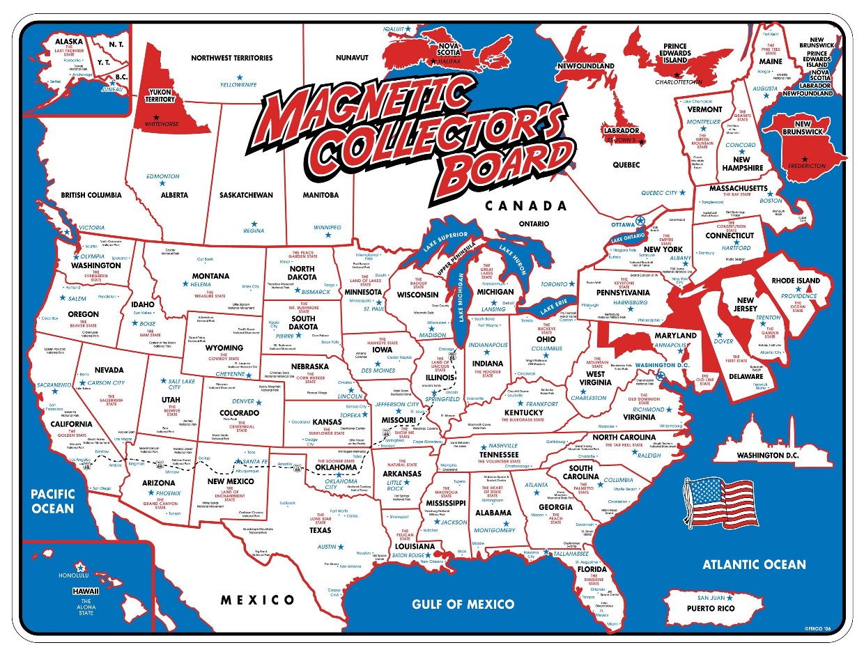 Do you need something to display your  state magnets on?  We’ve got a couple of solutions for you.  One is our state magnet collectors board.  This is a Metal board with a map of the USA on it.  It’s large enough to hold all state magnets, Canadian magnets, Puerto Rico and the US flag.